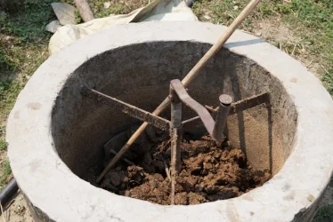 Key among these is the biogas tank for each household. Human and animal waste is broken down into fertilizer and methane gas with the addition of water and sunlight.